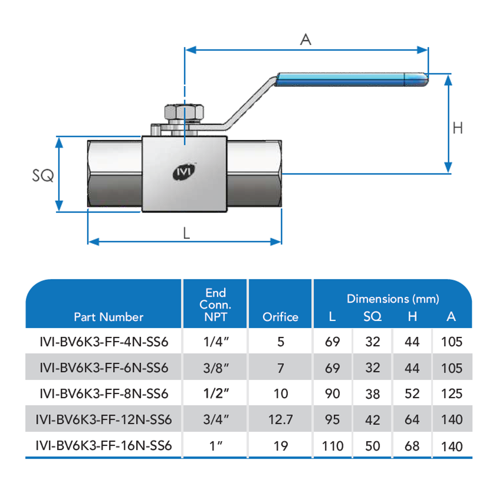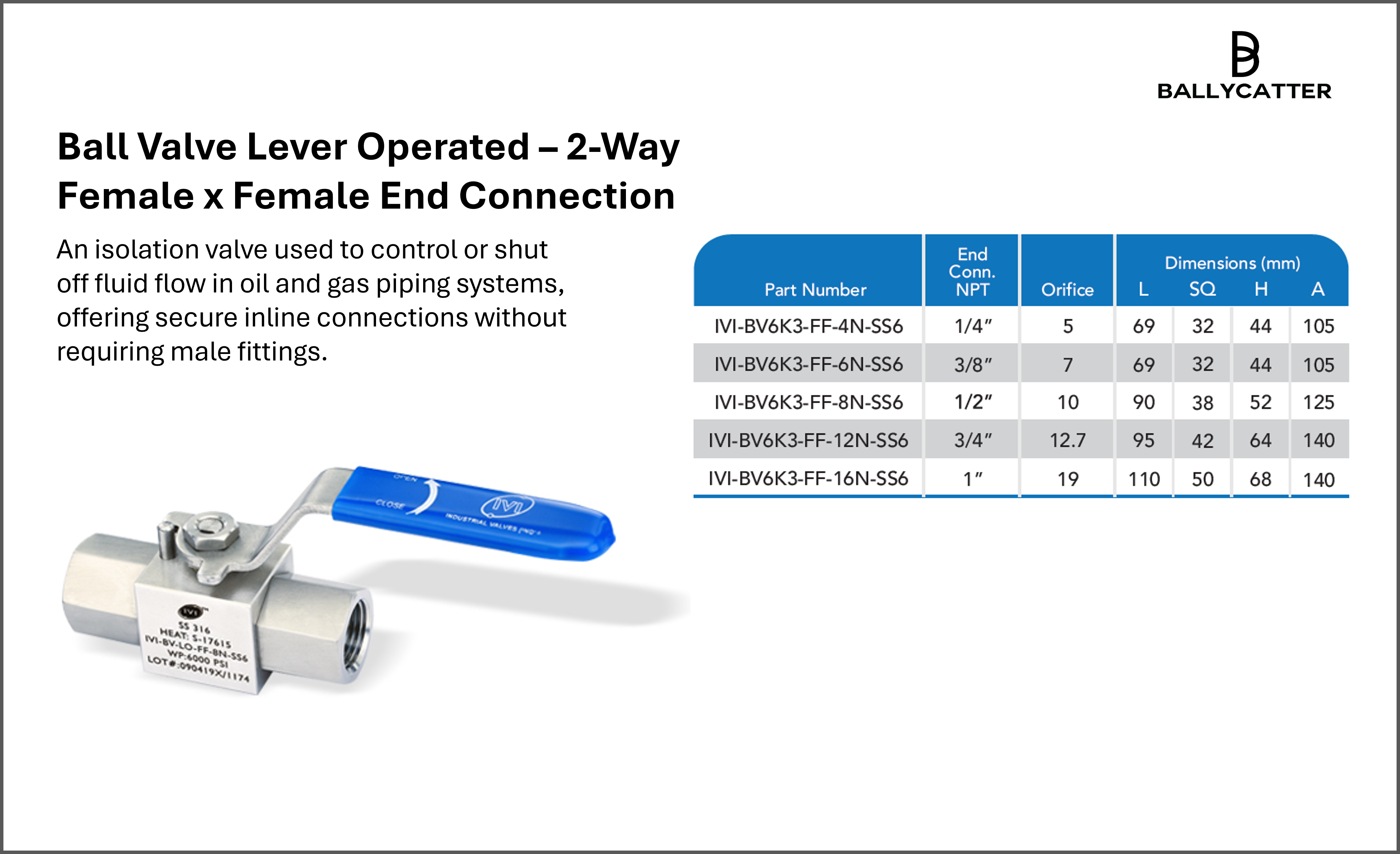 Ball Valve Lever Operated – 2-Way Female x Female End Connection – 1/4”, 3/8”, 1/2”, 3/4”, 1” – 6000 psi – ASME B16.34 / ISO 9001