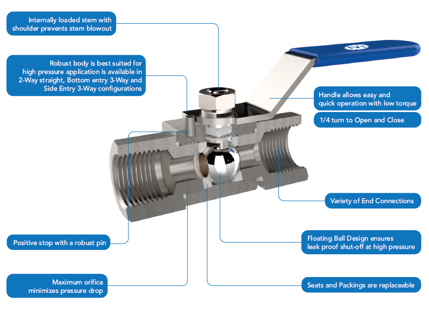 The valve features a floating ball design that provides seat wear compensation, ensuring consistent, leak-proof shut-off under high-pressure conditions. Operation is simple and efficient with a quarter-turn lever, allowing fast opening and closing with low torque. The internally loaded stem with shoulder prevents blowout, enhancing operational safety, while replaceable seats and packings extend service life. The maximum orifice design also minimizes pressure drop across the valve.