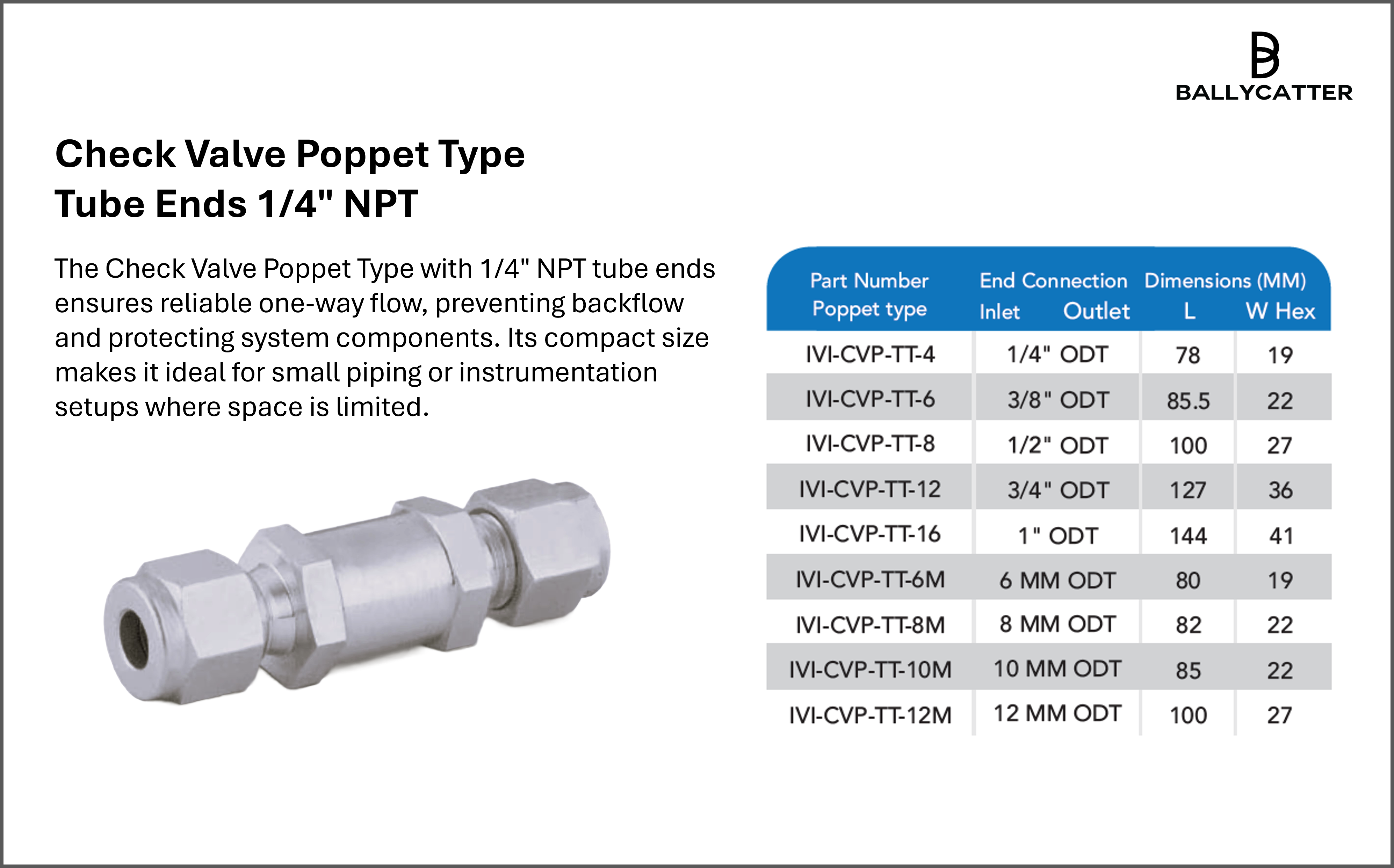 The Check Valve Poppet Type with 1/4" NPT tube ends is a compact valve that ensures flow moves in only one direction while blocking reverse flow. The poppet design uses a spring-loaded internal mechanism that opens under forward pressure and instantly closes when pressure drops or reverses.