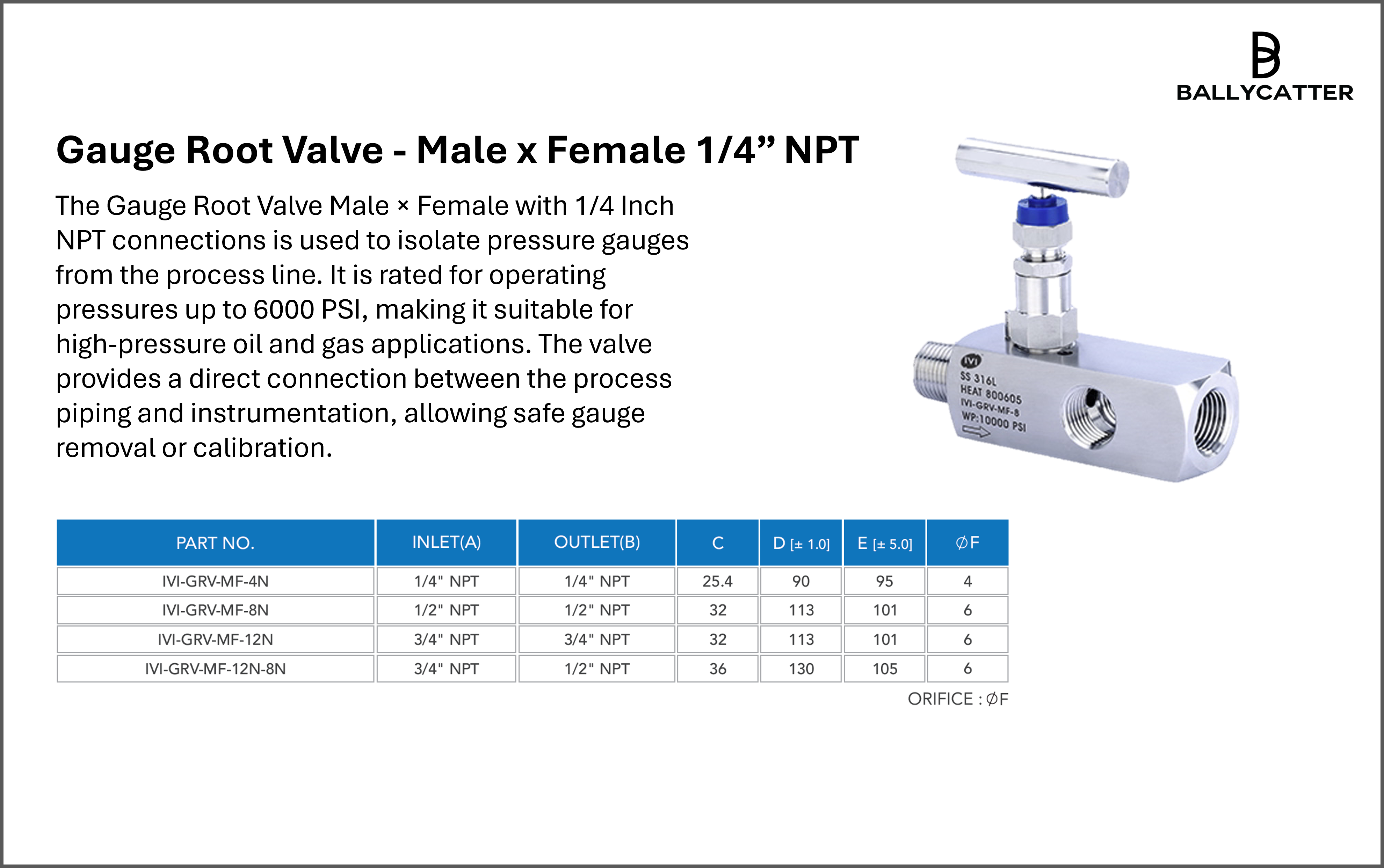 This 1/4 inch NPT Gauge Root Valve with Male x Female connection is designed to isolate pressure gauges in high-pressure systems up to 6000 PSI, ensuring accurate and safe readings. It provides reliable metal-to-metal sealing for pressures and temperatures typical in oil and gas and industrial applications. The Male x Female connection allows easy inline installation and secure integration with existing gauge lines, making it ideal for protecting gauges in small-bore instrumentation systems.