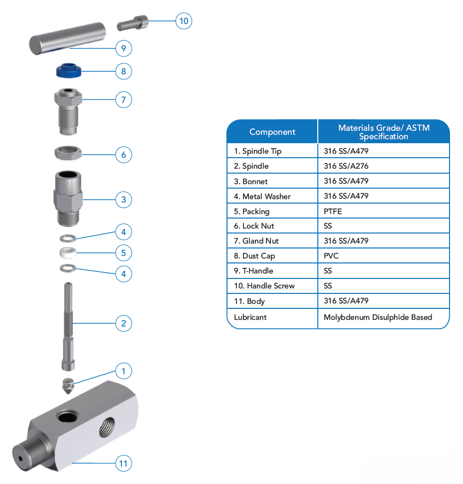 Additional design features include a simple, adjustable gland retainer for stable packing, a back seat for added security, a removable T-handle for low torque operation, and a dust cap to protect the stem from contamination. All valves are 100% factory tested for seat and packing leakage using nitrogen gas at 1000 PSI, ensuring reliable performance. This valve is ideal for isolating and protecting pressure measurement instruments.