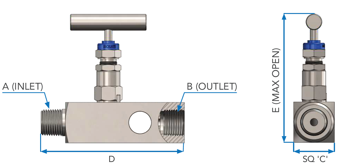 The valve is constructed and tested according to ASME B16.34 for pressure and temperature ratings and complies with ISO 9001, PED, and ATEX standards, confirming quality and suitability for use in hazardous or pressurized environments. It has a standard working pressure of 6000 PSI, with higher pressures available upon request. The metal-to-metal body and bonnet seal ensures high-pressure and temperature performance, and the self-centering, non-rotating stem tip provides consistent shutoff for leak-free operation.