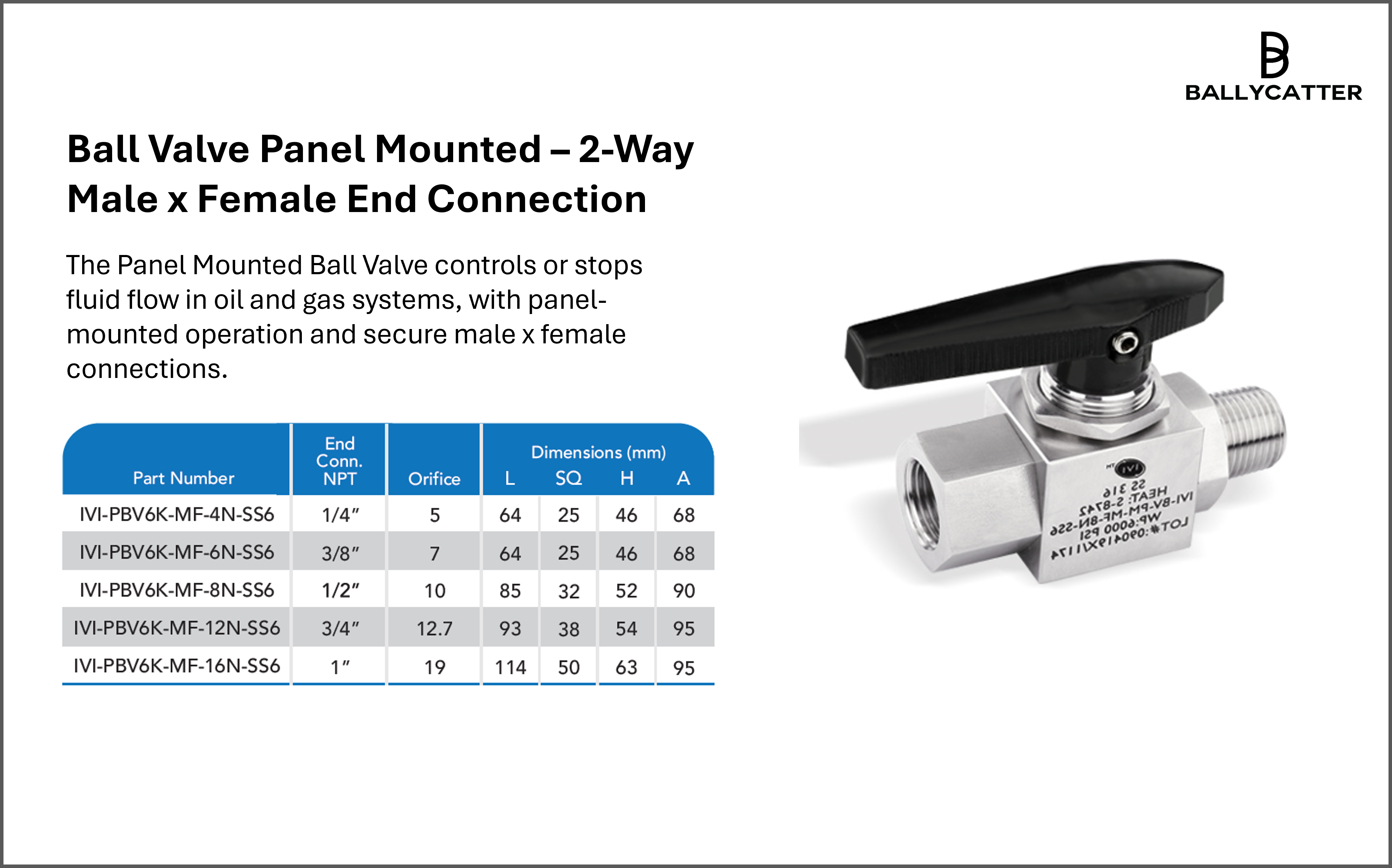 Ball Valve Panel Mounted – 2-Way Male x Female End Connection – 1/4”, 3/8”, 1/2”, 3/4”, 1” – 6000 PSI – ASME B16.34 / ISO 9001