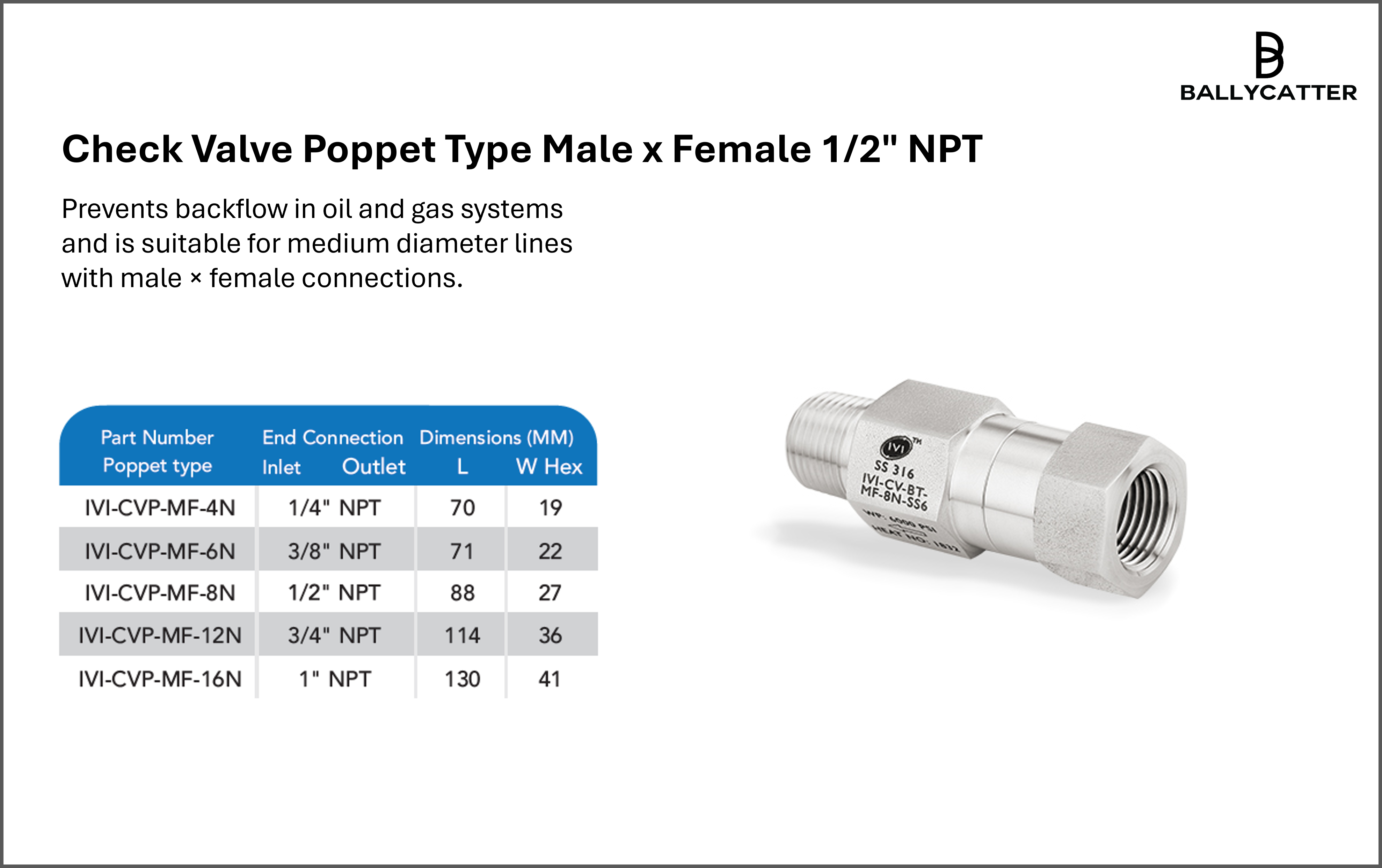 The 1/2" poppet type check valve prevents backflow in oil and gas systems and is suitable for medium diameter lines with male × female connections.Sign in
