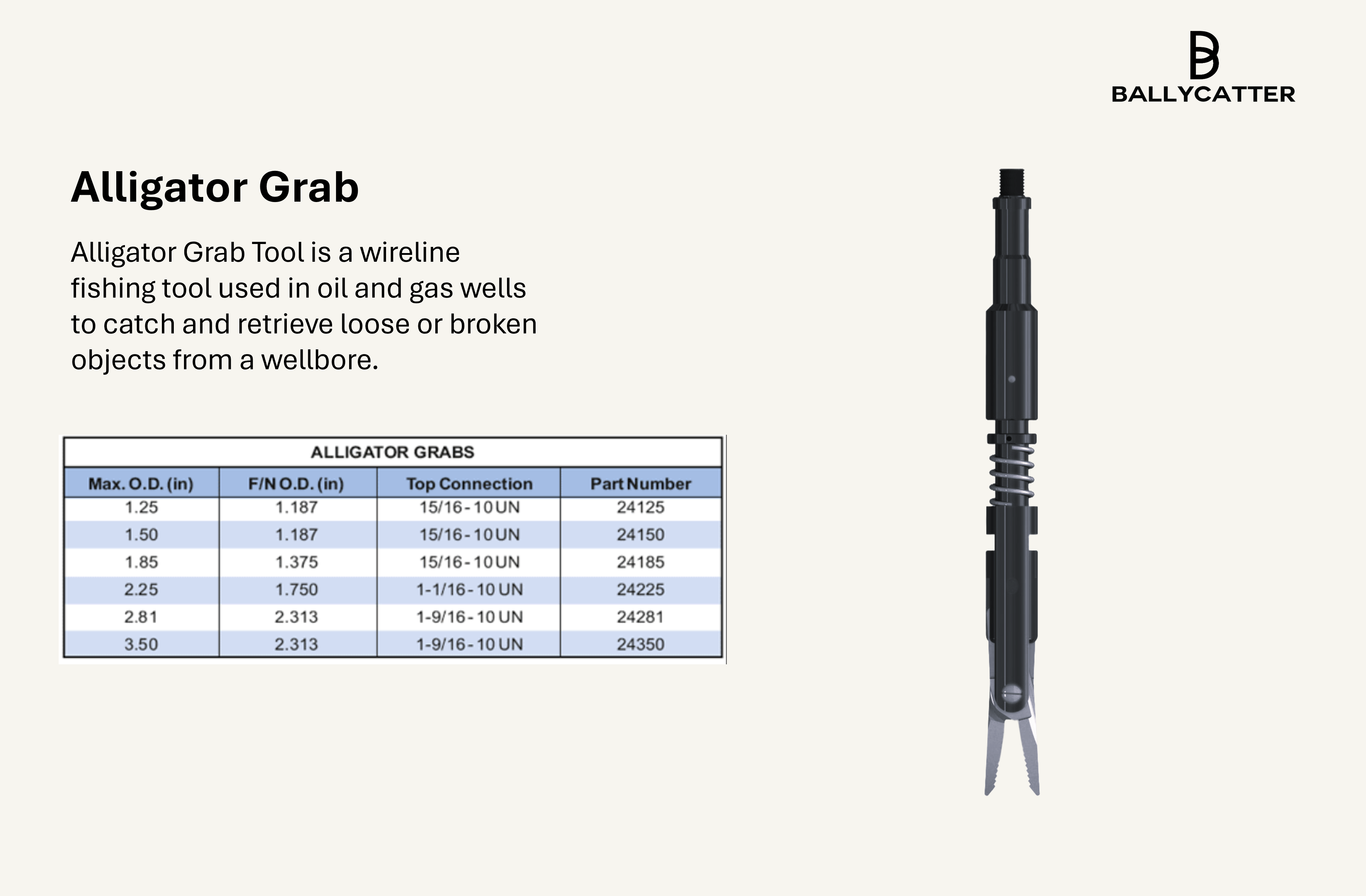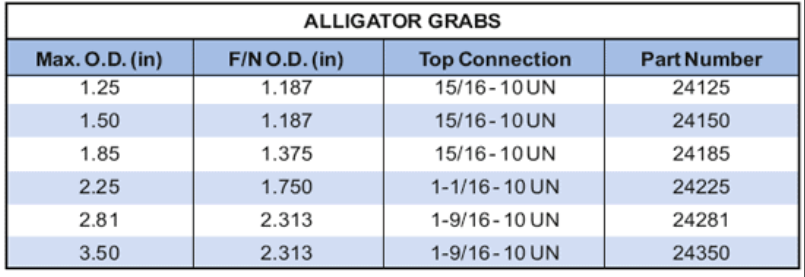 The Alligator Grab comes in various sizes, with a maximum outside diameter of 1.25 to 3.50 inches, a fishing neck O.D. of 1.187 to 2.313 inches, and top connections ranging from 15/16-10 UN to 1-9/16-10 UN. It includes fishing necks and pin threads compatible with standard wireline equipment.
