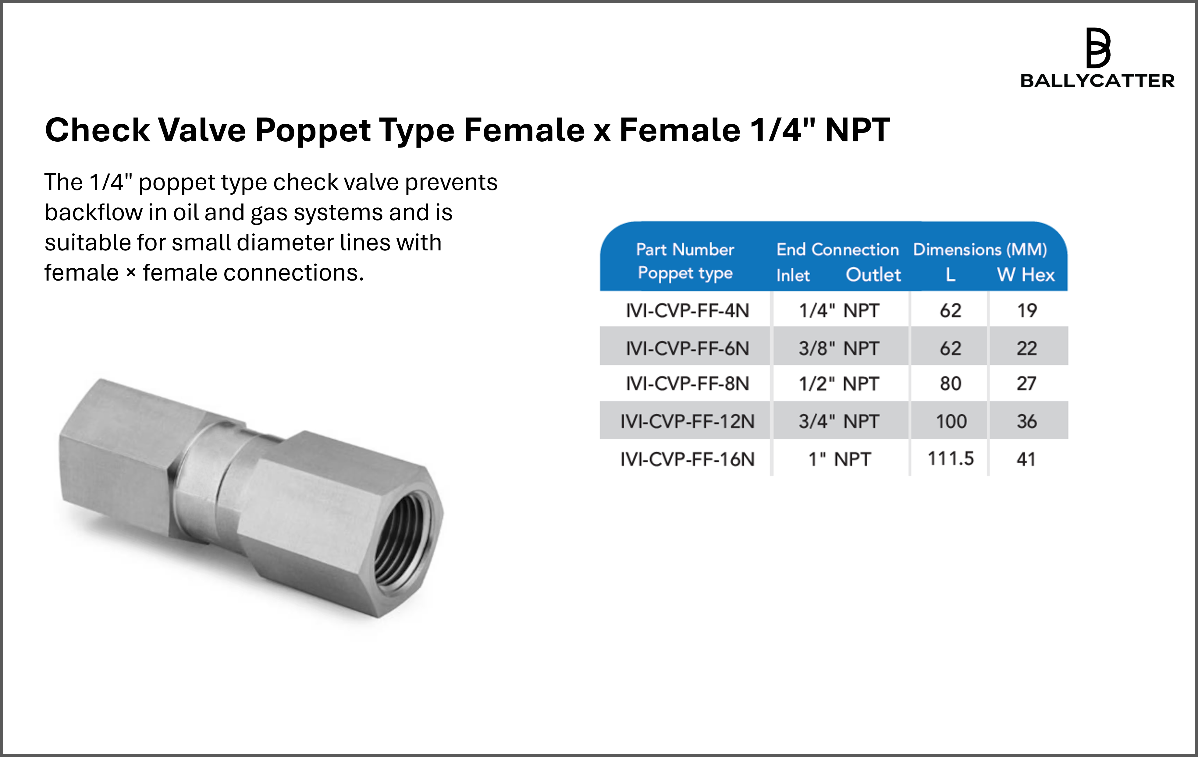 The 1/4" poppet type check valve prevents backflow in oil and gas systems and is suitable for small diameter lines with female × female connections.Sign in