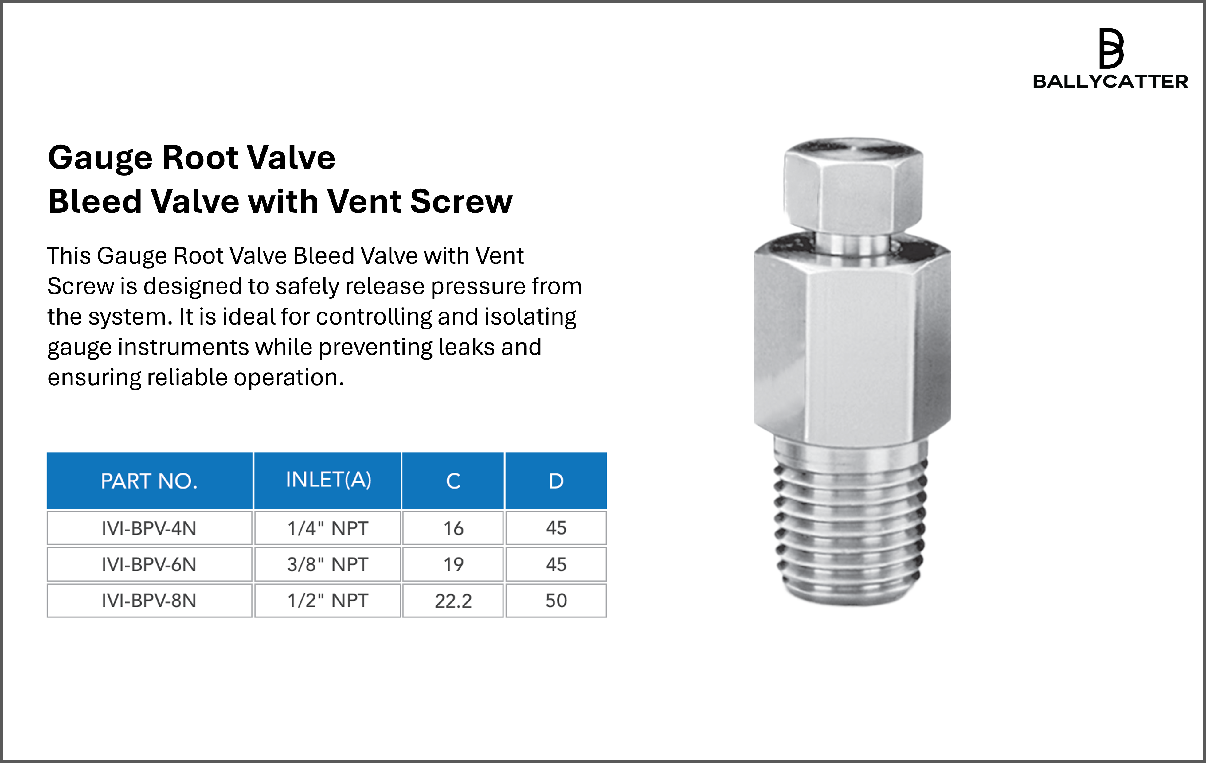 - Handle allows easy manual operation for isolating and venting.
