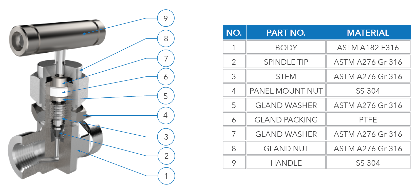 These valves feature a removable T-handle for easy actuation with low torque, rolled stem threads for smooth operation and long service life, and fully supported packing to minimize maintenance. A self-centering, non-rotating stem tip ensures bubble-tight shutoff, while the mirror-finished stem reduces wear on packing and facilitates smooth operation. Optional stellite-tipped stems are available for applications involving abrasive or corrosive fluids, further extending the valve’s lifespan.