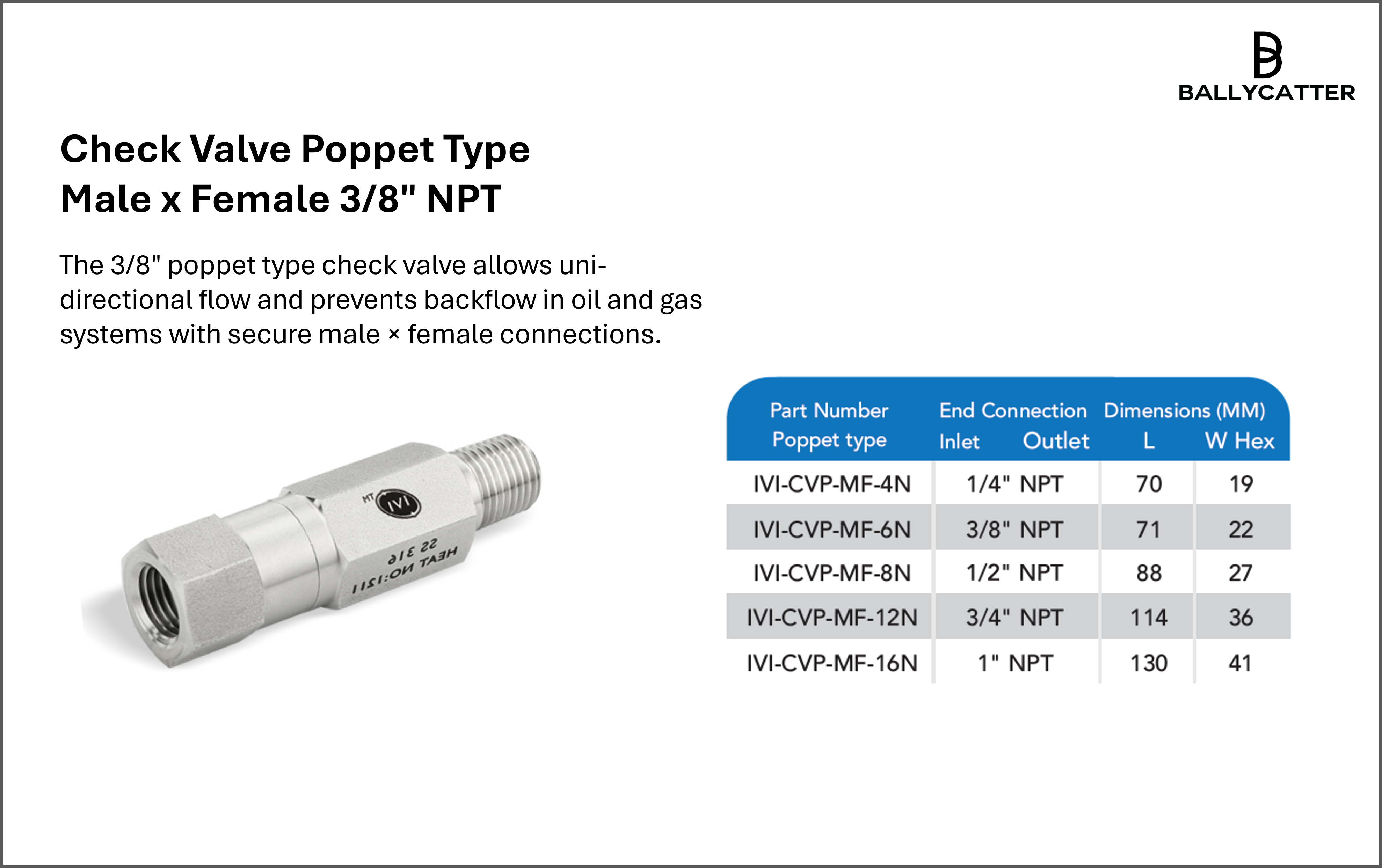The 3/8" poppet type check valve allows uni-directional flow and prevents backflow in oil and gas systems with secure male × female connections.Sign in