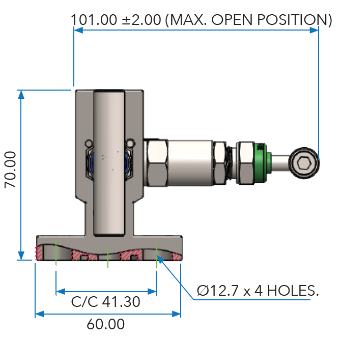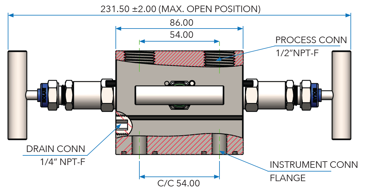 The manifold is built with 1/2” Female NPT Pipe to Flange connections set on 54mm (2-1/8”) centers, providing standardized and secure interfacing with pressure transmitters. High-quality construction includes metal-to-metal body and bonnet seals to withstand pressures up to 6000 PSI and temperatures ranging from -50°C to 230°C, with higher temperature ratings available using graphite materials. The design ensures leak-free performance through features such as self-centering, non-rotating valve tips, back-seated stems for added security, and rolled threads for smooth operation.