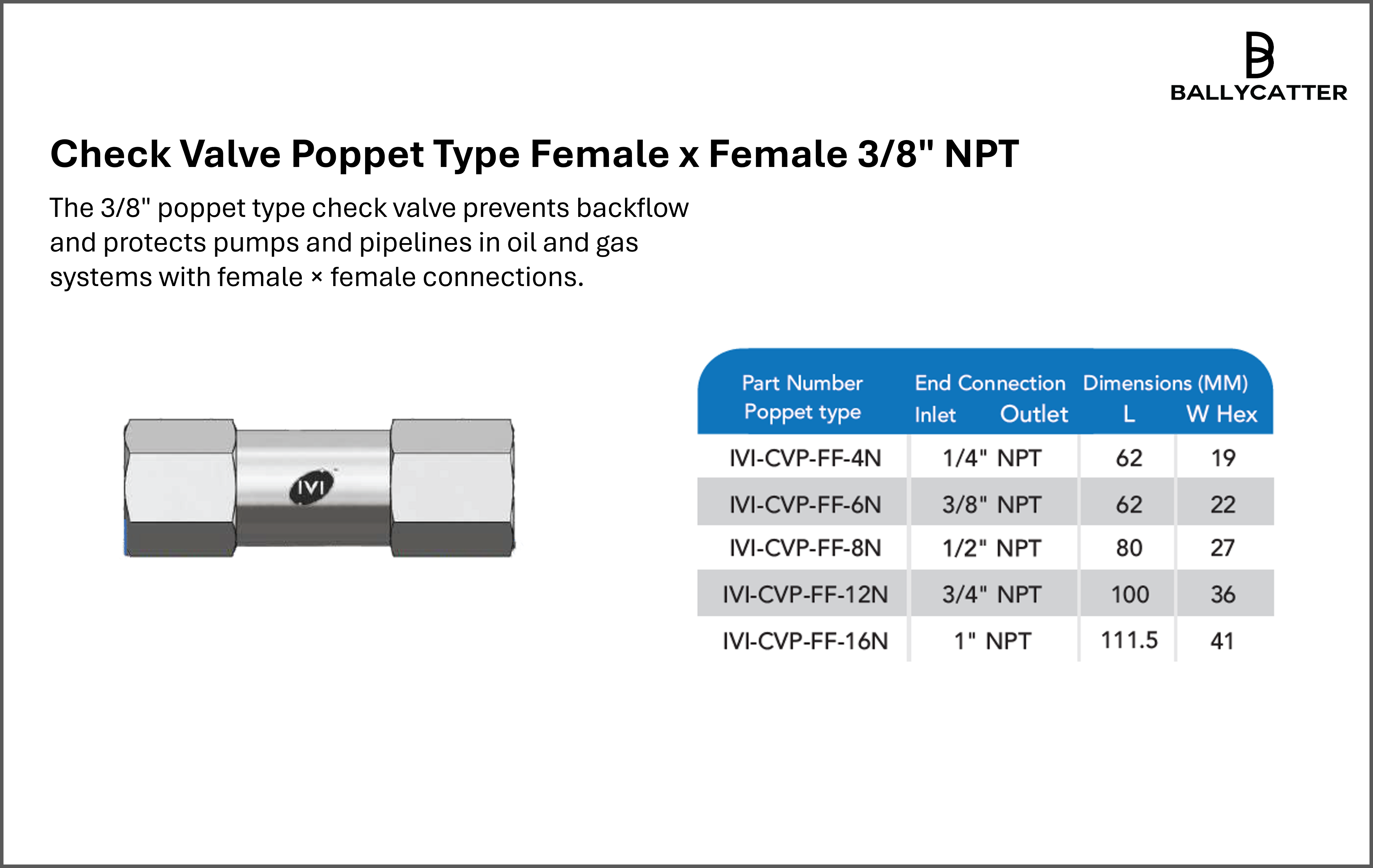 The 3/8" poppet type check valve prevents backflow and protects pumps and pipelines in oil and gas systems with female × female connections.Sign in