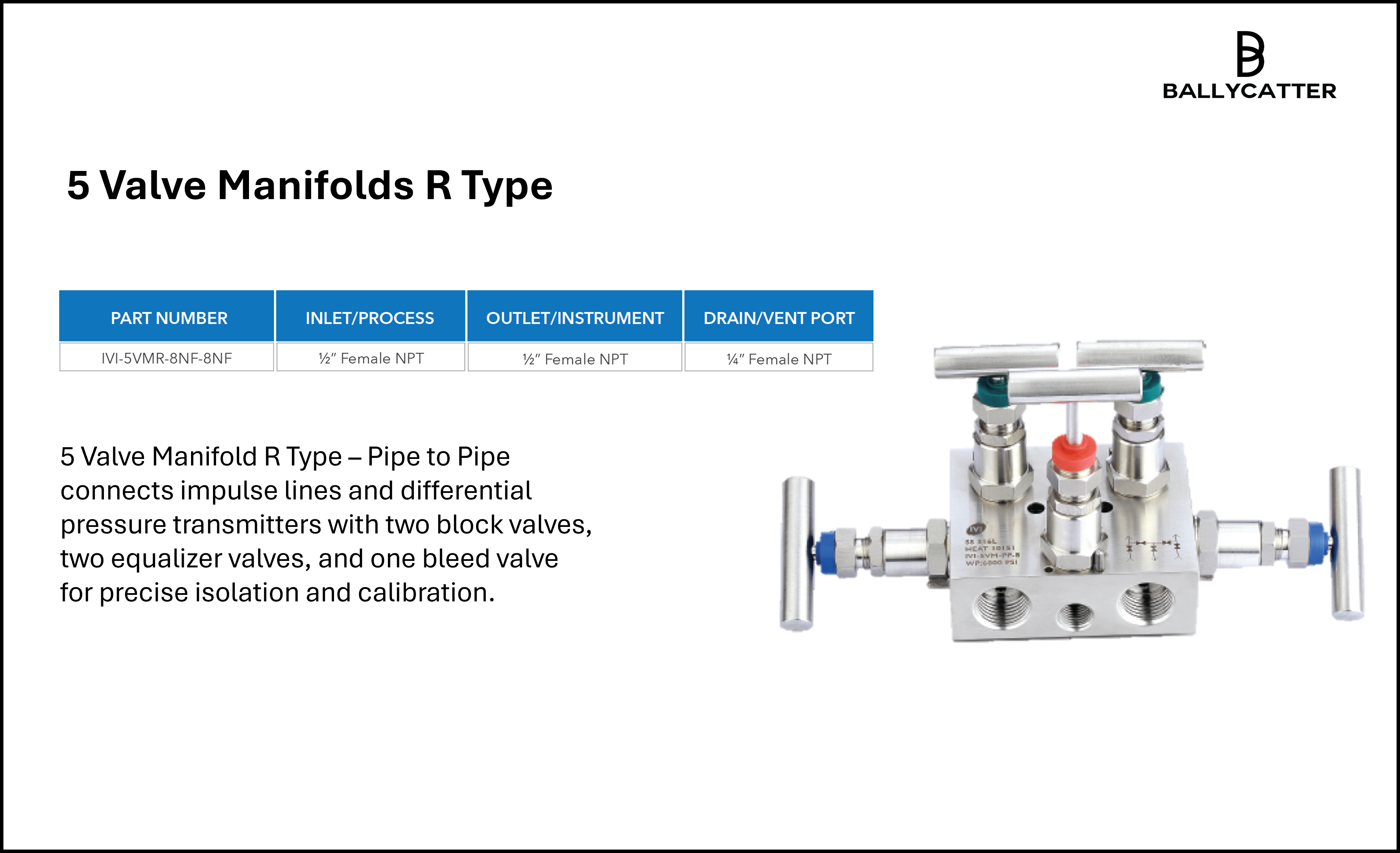The 5 Valve Manifold R Type – Pipe to Pipe is designed for connecting impulse lines to differential pressure transmitters in the oil and gas industry. Its configuration of two block valves, two equalizer valves, and one bleed valve allows safe isolation, accurate calibration, and easy maintenance of pressure systems. This R Type manifold is chosen when multiple valve functions are needed in a compact, reliable, and high-pressure rated solution.