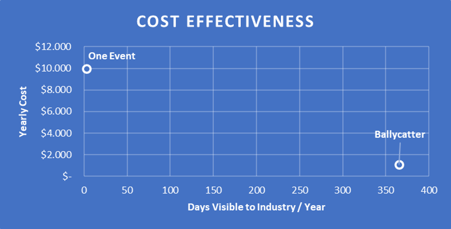 Ballycatter is the more budget-friendly option, significantly reducing promotional expenses compared to participating in exhibitions. Exhibitions require substantial investments in booth space, design, and logistics, while Ballycatter offers a cost-effective digital alternative without the overheads associated with physical events.